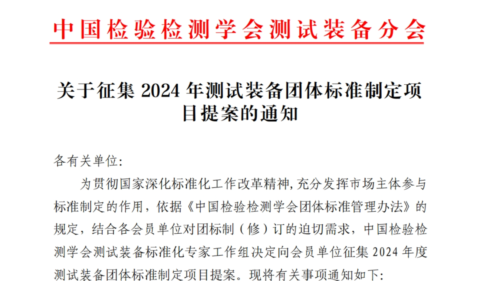 關(guān)于征集2024 年測(cè)試裝備團(tuán)體標(biāo)準(zhǔn)制定項(xiàng)目提案的通知