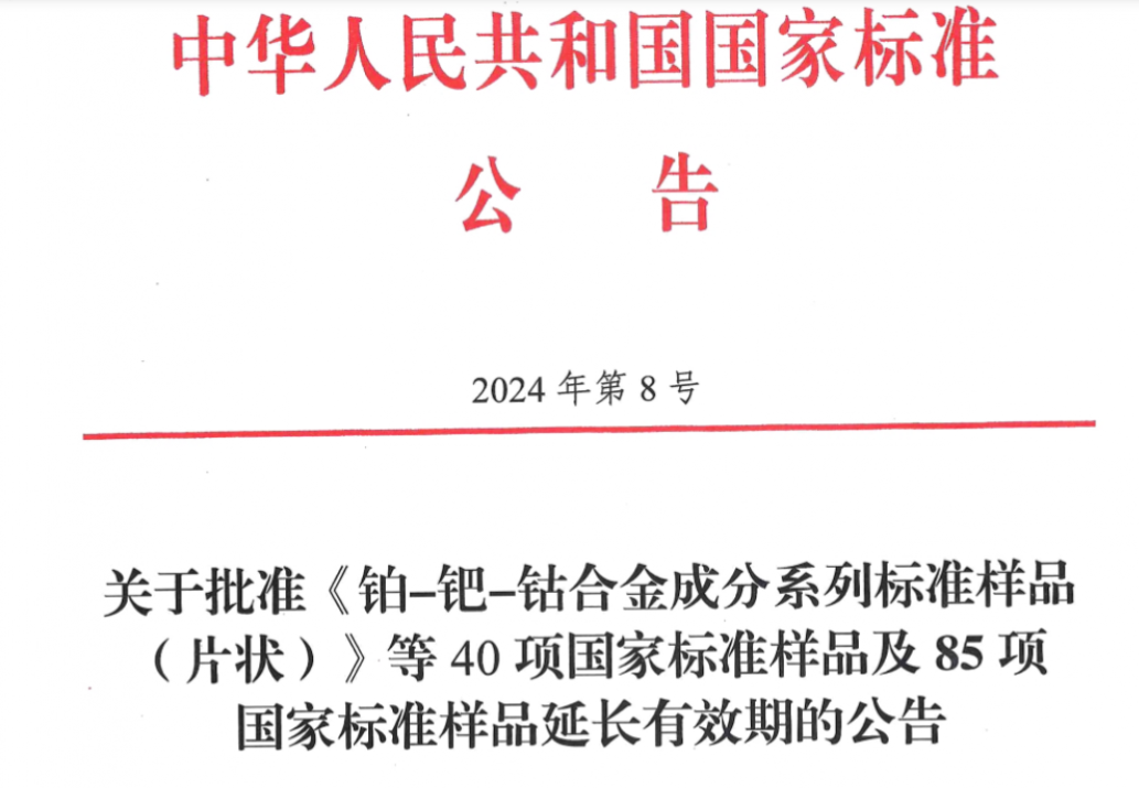 國家市場監(jiān)督管理總局(國家標準化管理委員會)批準《鉑-鈀-鈷合金成分系列標準樣品(片狀)》等40項國家標準樣品,并延長85項國家標準樣品有效期,現(xiàn)予以公告。